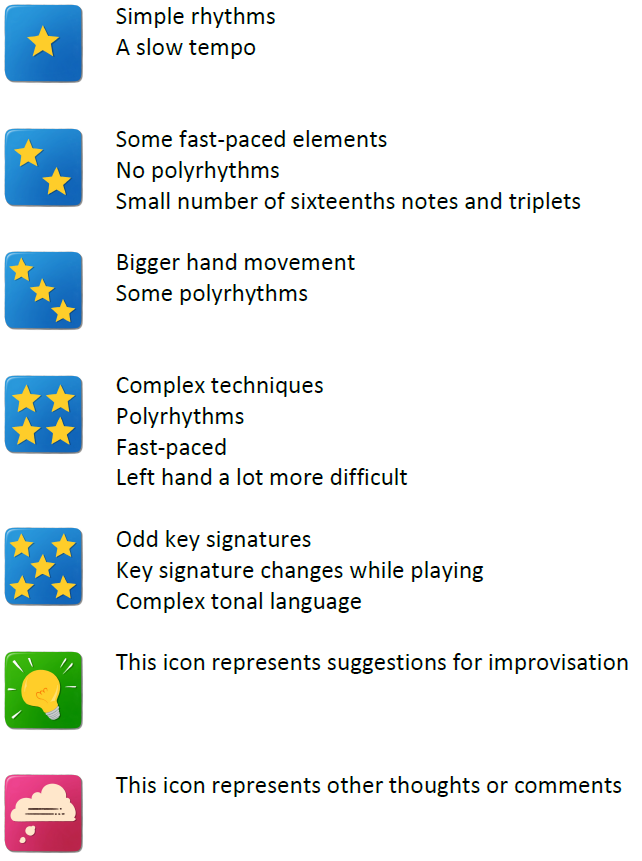 The icons representing the difficulty consist of 1 to 5 stars, and they are a relative measure to differentiate the compositions in this book. Here is a list of all the icons used: